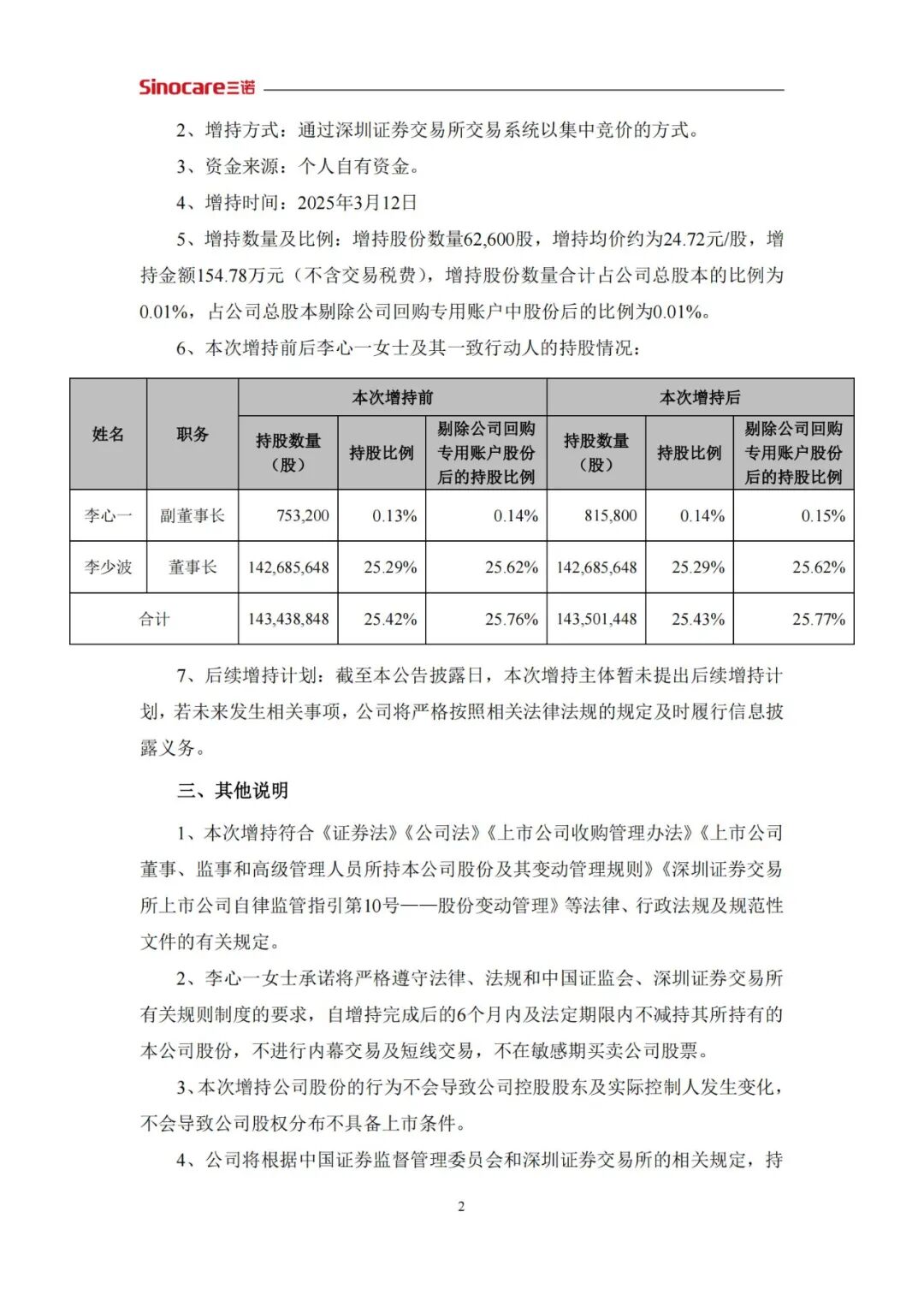 公司副董事长李心一于3月12日以其自有资金以集中竞价交易方式累计增持公司股份6.26万股,