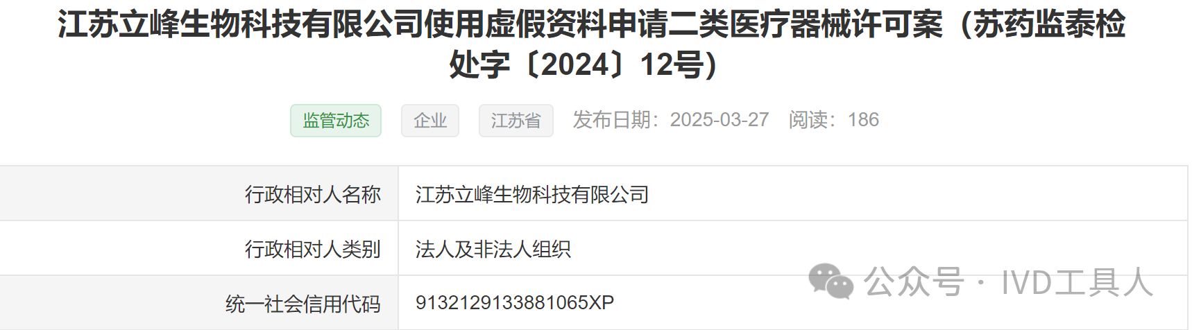 据江苏省药品监督管理局消息,江苏立峰生物科技有限公司因伪造第二类医疗器械注册相关资料被通报处罚。