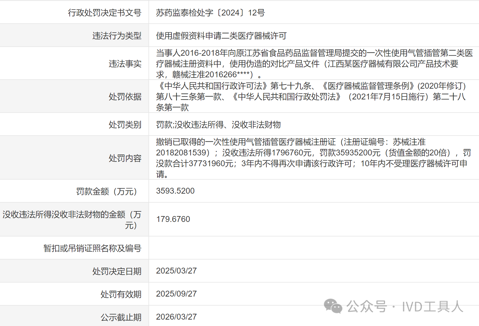 处罚结果:撤销已取得的一次性使用气管插管医疗器械注册证(注册证编号:苏械注准20182081539);没收违法所得1796760元,罚款35935200元(货值金额的20倍),罚没款合计37731960元;3年内不得再次申请该行政许可;10年内不受理医疗器械许可申请。