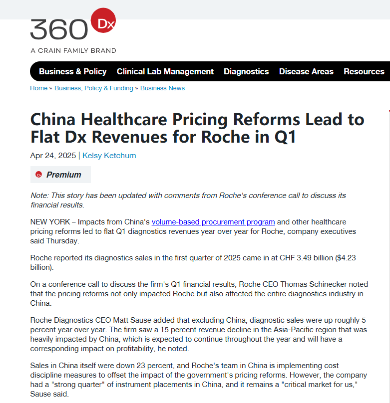 据360DX报道,罗氏公司高管周四表示,中国集采和其他医疗保健定价改革的影响导致罗氏第一季度的诊断收入同比持平。罗氏报告称,其 2025年第一季度的诊断销售额为 34.9 亿瑞士法郎(42.3 亿美元)。