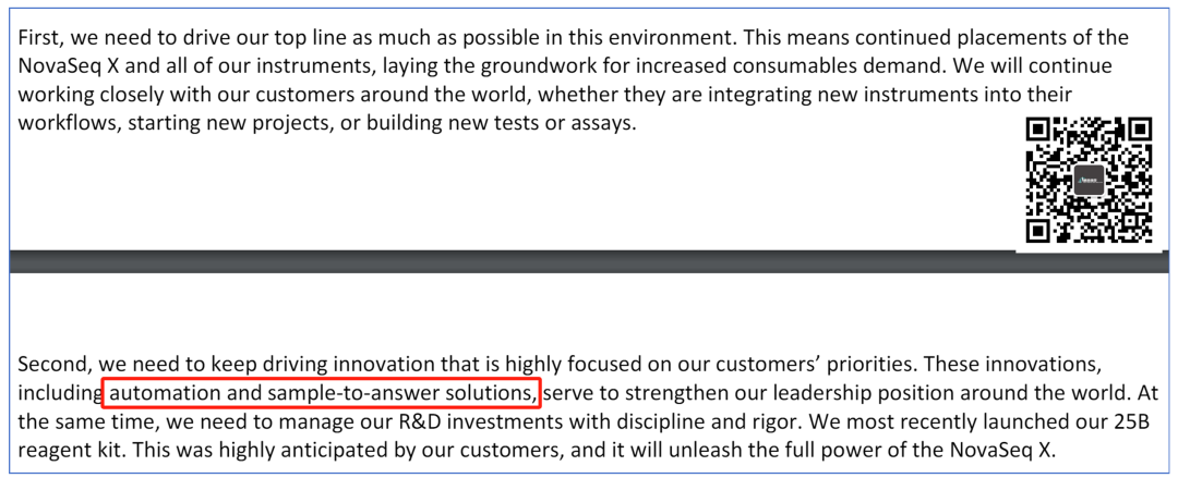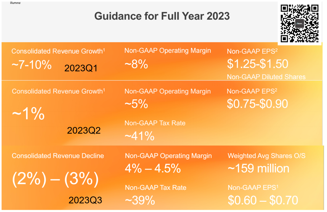 CEO的蛛丝马迹作为首次公开露面,新CEO Jacob Thaysen也是介绍了下自己。Jacob认为,短期宏观经济情况并不会得到改善,而地缘政治冲突持续。成立特别委员会厘清GRAIL的决策问题,并聘请顾问准备出售GRAIL。因为诉讼仍在进行中,所以预期将秘密向SEC(美国证券交易委员会)提交文件,此后将联系第三方作为投资资金来源或潜在的买方。Illumina将聚焦自己的主营业务,并且控制研发成本。Illumina的创新将主要聚焦于客户的优先需求,包括自动化和样本到结果的解决方案。面对2023年的财务预期一降再降,Illumina也是退无可退。从最开始的营收增长7%—10%,到2023Q3的预估下降2%—3%。只是看着3年来第一次降到10亿美元以下的现金和现金等价物,略微有点让人难以接受。不过,好在总的流动性资产还是20亿美元以上,总体看来问题不大。反正对Jacob来说,新官不理旧账也是不错的选择。这都是Francis deSouza干的好事,与我无关。