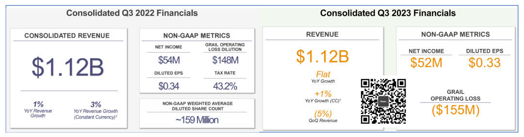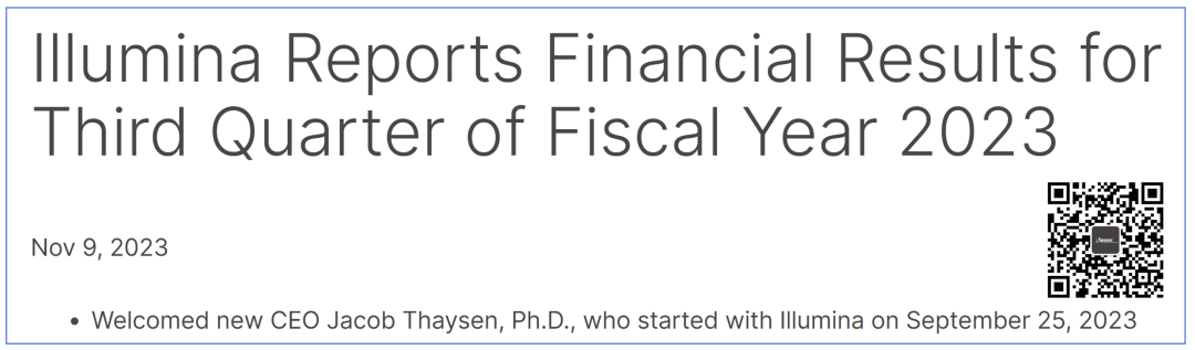 2023年11月9日,测序仪巨头Illumina公布了最新的2023Q3财报。而这,也是新CEO Jacob Thaysen 2023年9月25日加入Illumina以来的首份财报。恰到好处的是,这份财报既跟他有关系,又没有太大的关系。根据财报显示,2023Q3 Illumina营收11.2亿美元,同比增长0.36%。净利润5200万美元,相对去年同期的5400万美元微降3.7%。本季度亏损高达7.54亿,虽然比起2022年的那场38.16亿美元的雪暖和了很多,但是依然是沉甸甸的爱。