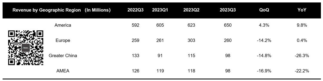 我们把最近几个季度的数据拿出来就会发现,Illumina的核心业务不容乐观。还好,核心的毛利率没有继续下滑,保住了66%的关口。GAAP规则下,GRAIL又减记了8.21亿美元的商誉。这货去年同期减记了39.14亿,加上今年同期的8.21亿,一共46亿+。好家伙,80亿买的...这亏钱速度不比老股民差啊。即便是根据NON-GAAP会计规则,这货本季度也亏了1.55亿美元。你说,他2100万美元营收跟1000万营收有区别么?多赚了1100万=多亏了700万,赚了,又没完全赚。再来看Illumina另外一个大宝贝的表现,那就是NovaSeq X的出货量。其中Q3出货97台,反而不如2023Q2的出货量。两个大宝贝GRAIL和NovaSeq X都给新CEO献上了礼物,这个礼物不如就叫两肋插刀吧。美洲-最后的自留地从公司的收入区域划分上来看,似乎只有美洲保持住了增长的势头。非洲、中东区同比萎缩22.2%,环比萎缩16.9%。就连欧洲也仅仅是同比维持住了正增长的颜面,而环比也是出现了14.2%的萎缩。加之中东、欧洲继续动荡,大中华区虽然没有那种意义上的动荡,但是依然充满了火药味。这种火药味不是来自战场,而是来自商场,来自华大智造、来自真迈、来自赛陆...随着Element、Onso等美国本土新兴测序仪加速推进,这块美洲的自留地能留多久成了一个问号。面对如此局面,相信新CEO一定胸有成竹了,我们拭目以待即可。