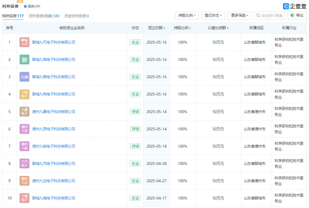 近日,九安医疗成立大量子公司,这些公司注册资本50万,命名上则采用统一的地区+九X+电子科技有限公司。据统计,自今年1月以来,此类公司九安医疗已成立37家,主要分布在山东聊城、德州、天津等地。
