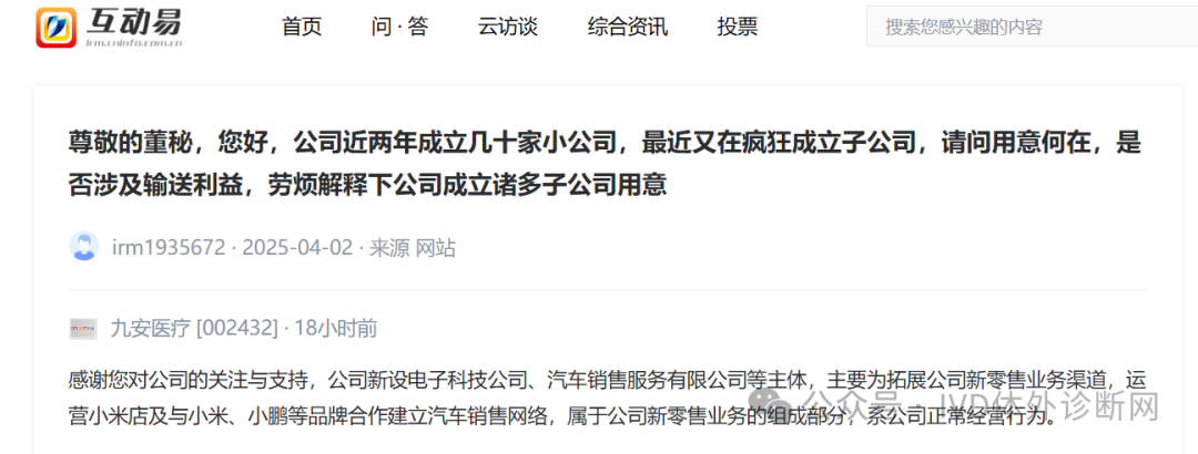 此前有投资者向九安医疗提问, 尊敬的董秘,您好,公司最近又在疯狂成立子公司,请问用意何在,是否涉及输送利益,劳烦解释下公司成立诸多子公司用意?