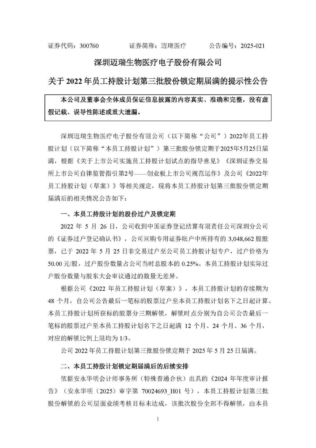 5月26日,迈瑞医疗发布公告,2022年员工持股计划第三批股份锁定期于2025年5月25日届满。该批次股份的解锁受公司层面业绩考核目标未达成的影响,导致该批次股份全部不得解锁,并将由员工持股计划管理委员会收回,或涉及约2700人。