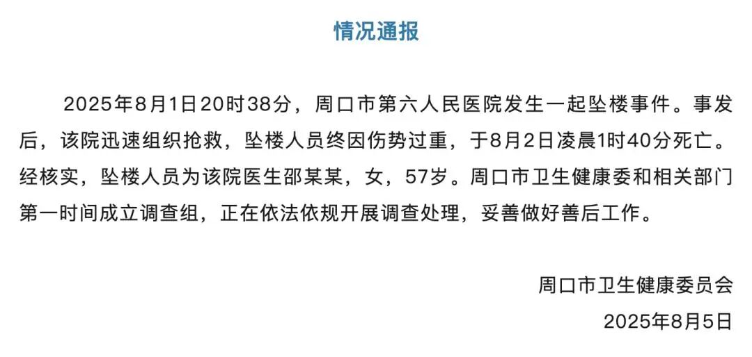 8月5日,河南省周口市卫生健康委员会发布情况通报称,2025年8月1日20时38分,周口市第六人民医院发生一起坠楼事件。事发后,该院迅速组织抢救,坠楼人员终因伤势过重,于8月2日凌晨1时40分死亡。经核实,坠楼人员为该院医生邵某某,女,57岁。周口市卫生健康委和相关部门第一时间成立调查组,正在依法依规开展调查处理,妥善做好善后工作。