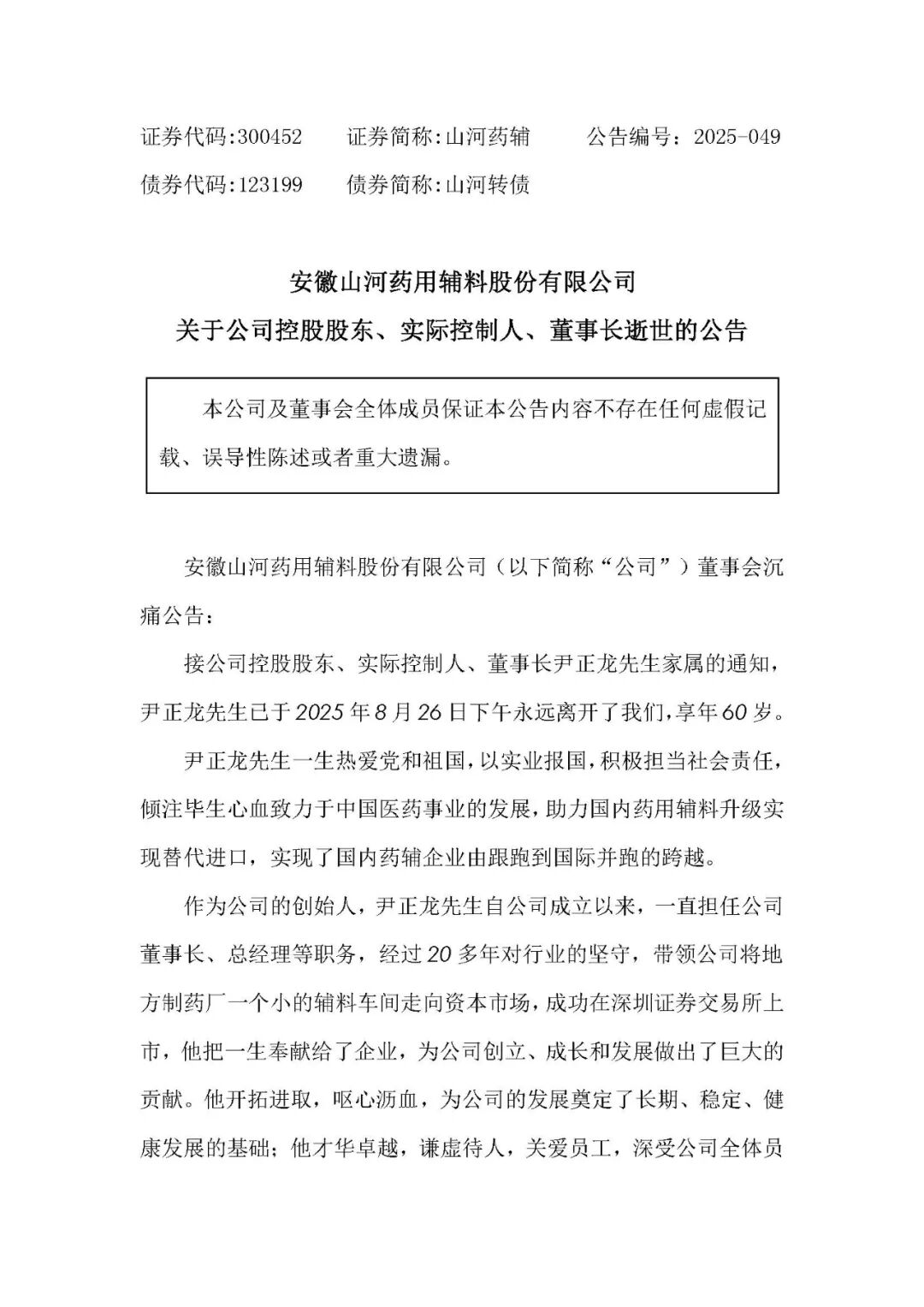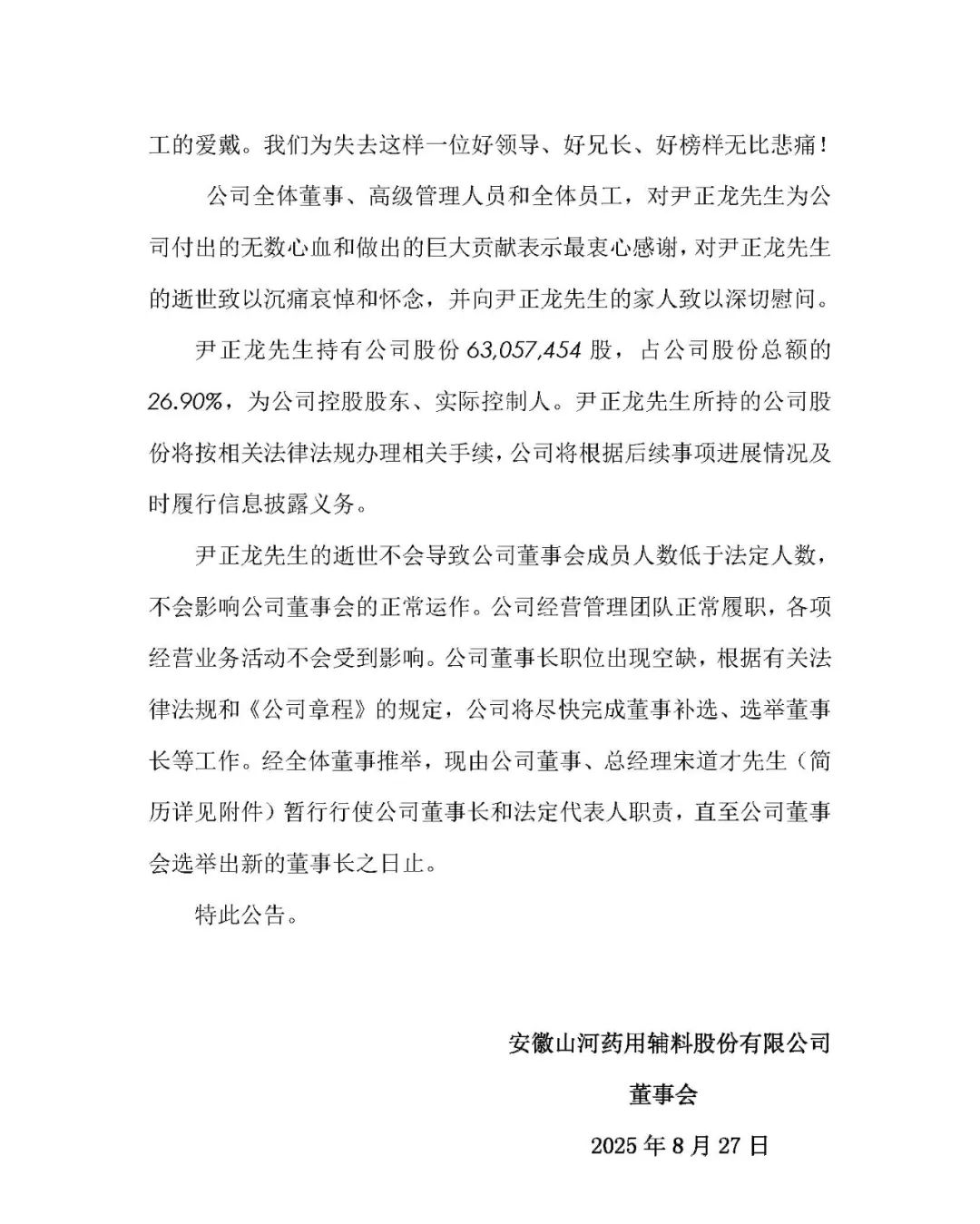 8月27日早间,安徽山河药用辅料股份有限公司公告,公司控股股东、实际控制人、董事长尹正龙逝世。