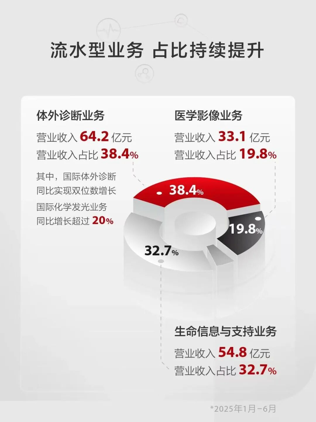 报告期内,公司国际业务同比增长5.39%,国际业务收入占公司整体收入的比重进一步提升至约50%。目前业务进度符合公司预期,预计 2025 年下半年国际业务增长将有所提速,其中国际体外诊断产线有望实现较快增长。