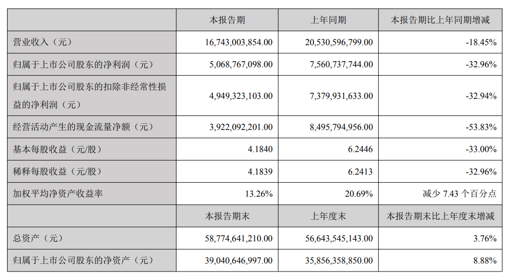 报告期内,公司实现营业收入1,674,300.39万元,较上年同期下降18.45%;实现归属于上市公司股东的净利润506,876.71万元,较上年同期下降32.96%。经公司初步测算,第三季度整体营业收入将实现同比正增长,同时延续营业收入金额逐季度环比改善的趋势。