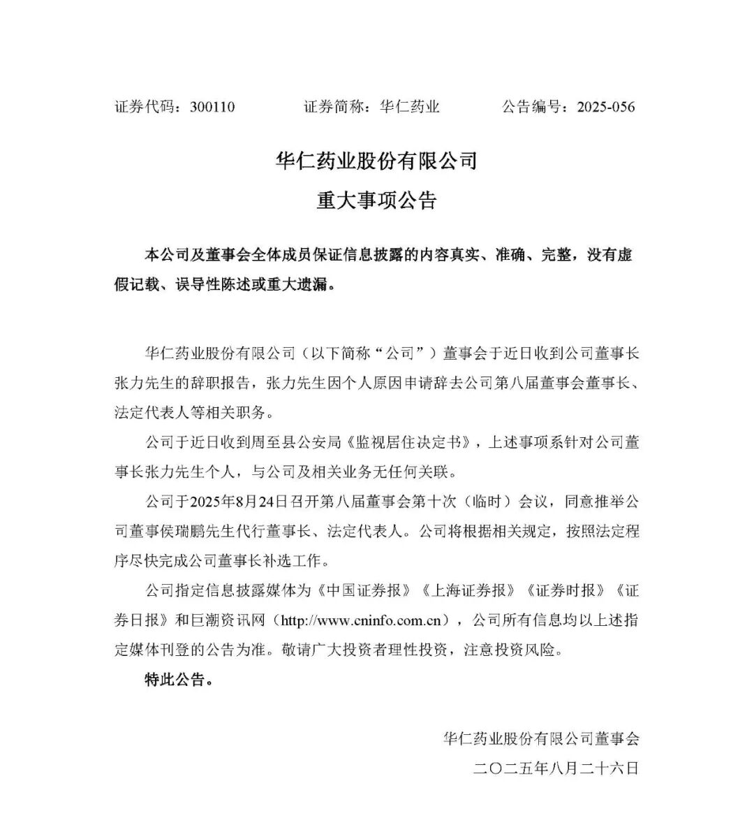 8月26日,华仁药业股份有限公司发布《重大事项公告》,董事会于近日收到公司董事长张力的辞职报告,因个人原因申请辞去公司第八届董事会董事长、法定代表人等相关职务。