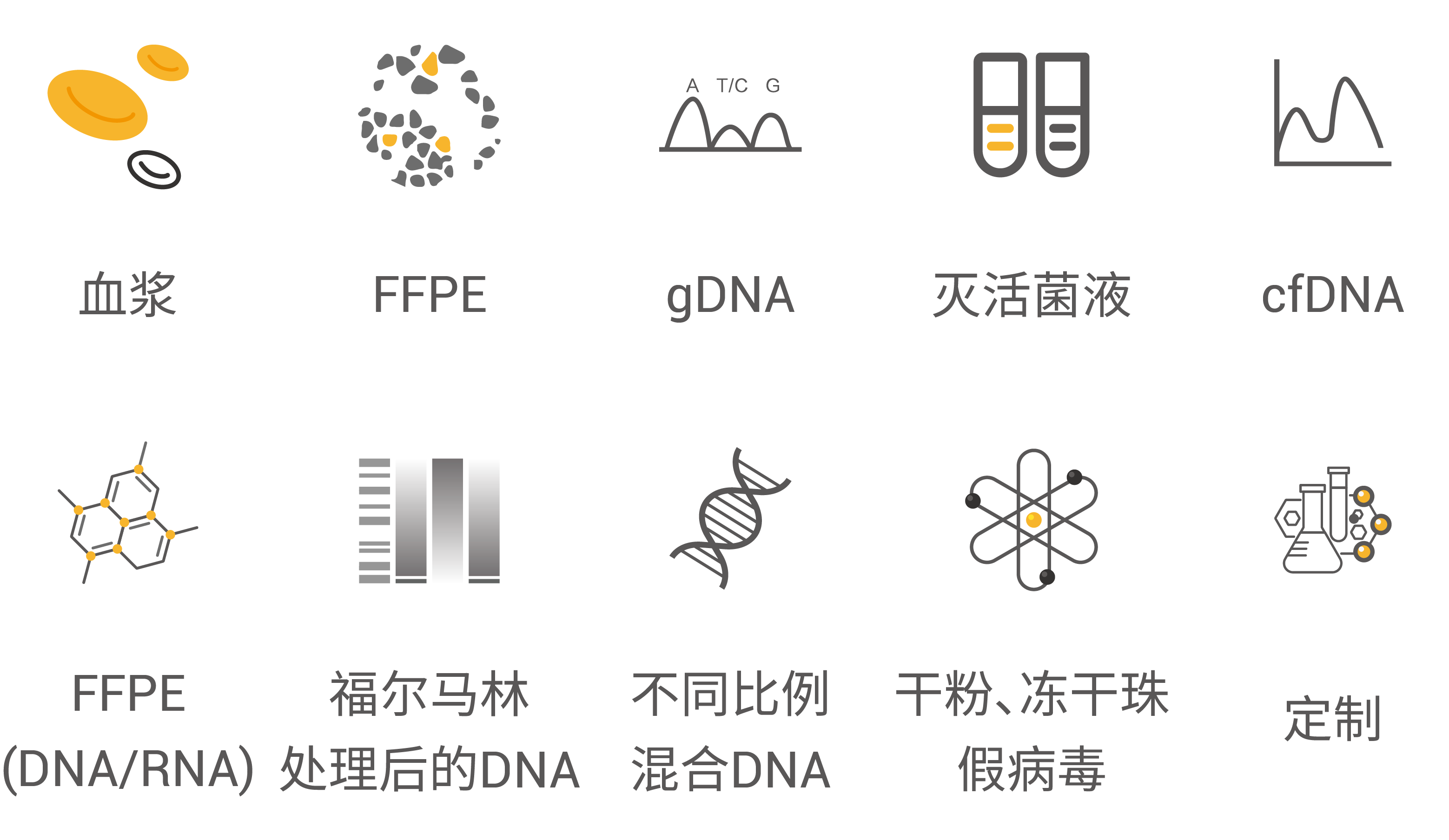 肿瘤伴随诊断质控品、TMB质控品、MSI质控品、BRCA质控品、HRR质控品、HRD质控品、FISH质控品、IHC质控品等。