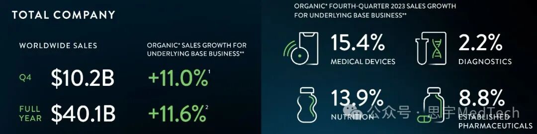 2023财年,雅培全年营收401.1亿美元,同比下降8.1%。除了诊断业务同比猛烈下跌39.4%外(99.88亿美元),营养品(81.54亿美元,增长9.3%)、药品(506.6亿美元,增长3.1%)、医疗器械业务(168.9亿美元,增长14%)都实现了正增长,(营养品和药品季度性疲软)。按地区划分,美国地区全年营收76.96亿美元,美国以外的地区营收91.91亿美元,这说明雅培很在意美国以外的市场。按业务部门划分,雅培医疗器械业务全部实现正增长。