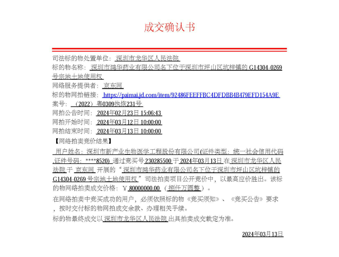 新产业生物以8000万元拍得深圳坪山区一宗土地使用权。