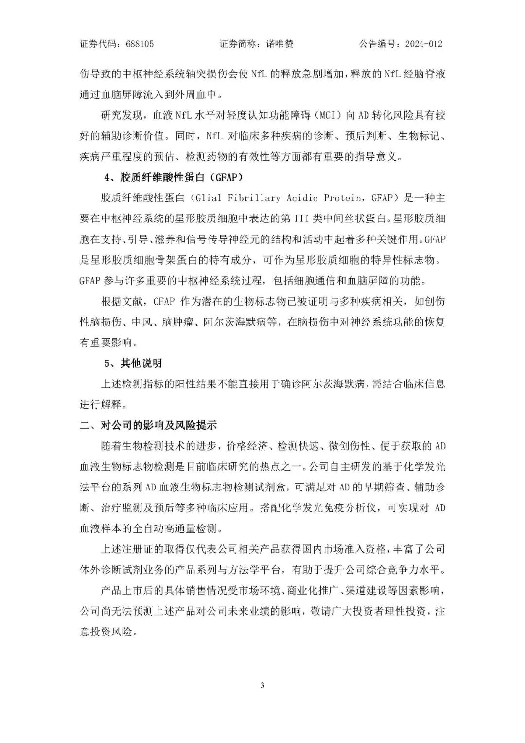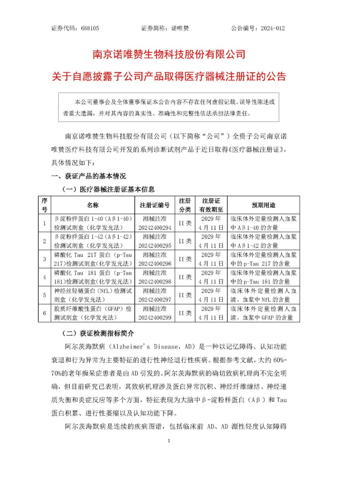 近日,诺唯赞全资子公司南京诺唯赞医疗科技有限公司开发的系列诊断试剂产品取得《医疗器械注册证》,6个产品全是用于AD检测的。