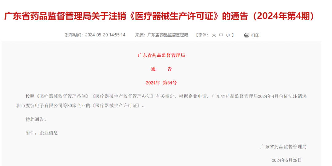 5月28日,广东省药品监督管理局发布关于注销《医疗器械生产许可证》的通告,其中涉及到两家IVD企业。分别为深圳天深医疗器械有限公司和深圳理邦实验生物电子有限公司。注销的许可证为:粤食药监械生产许20193379号,粤食药监械生产许20101878号。