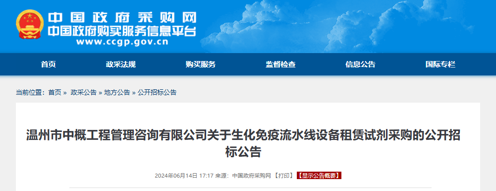 6月14日晚,中国政府采购网发布《温州市中概工程管理咨询有限公司关于生化免疫流水线设备租赁试剂采购的公开招标公告》。其中写明,本项目预算金额为1710万,采购需求为生化免疫流水线设备租赁试剂采购。