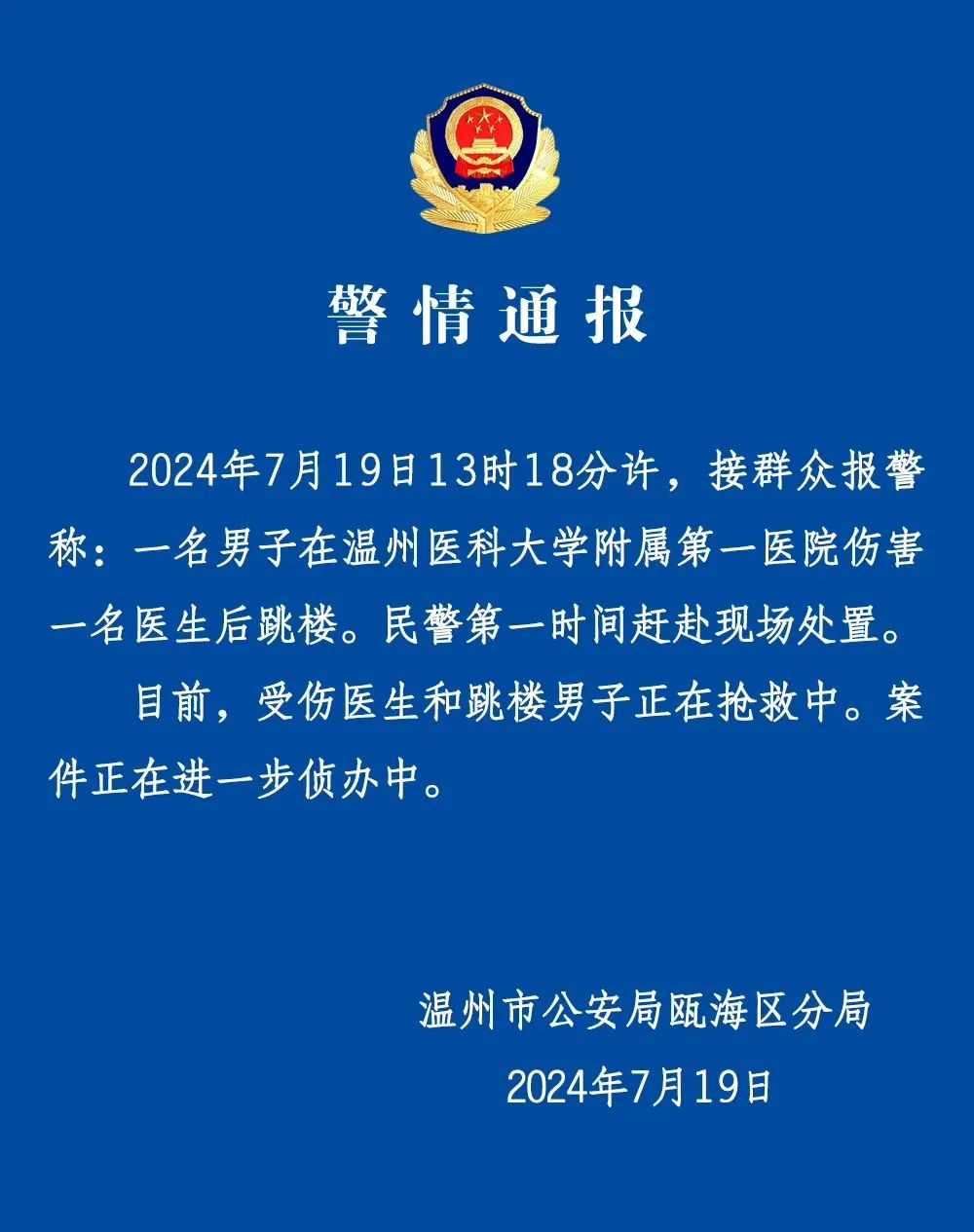 7月19日晚间,微博 @平安瓯海 发布警情通报:「2024 年 7 月 19 日 13 时 18 分许,接群众报警称:一名男子在温州医科大学附属第一医院伤害一名医生后跳楼。目前,受伤医生和跳楼男子正在抢救中。」