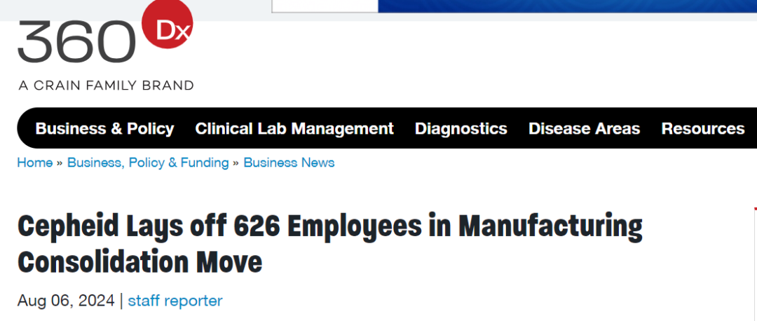 根据7月31日提交给加州的《工人调整和再培训通知》(WARN)报告,丹纳赫子公司Cepheid 上周发出通知,将从其位于加州桑尼维尔的制造中心裁员626人。约占其4800名员工的13%。