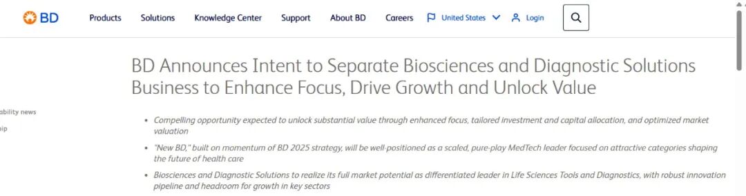 2月6日,碧迪医疗(Becton Dickinson)官网发布通知称,其董事会已一致授权BD管理层实施一项计划,将碧迪医疗的生物科学和诊断解决方案业务与其他业务分开,以加强碧迪医疗和分离后业务的战略重点和增长导向型投资和资本配置,并为股东创造价值。