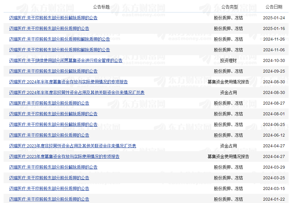 2024年,迈瑞发布了13条则关于控股股东股权质押的公告。