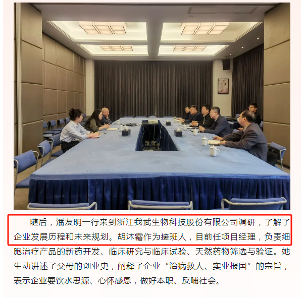 在相关领导调研我武生物时,胡沐霜作为接班人出面接待。