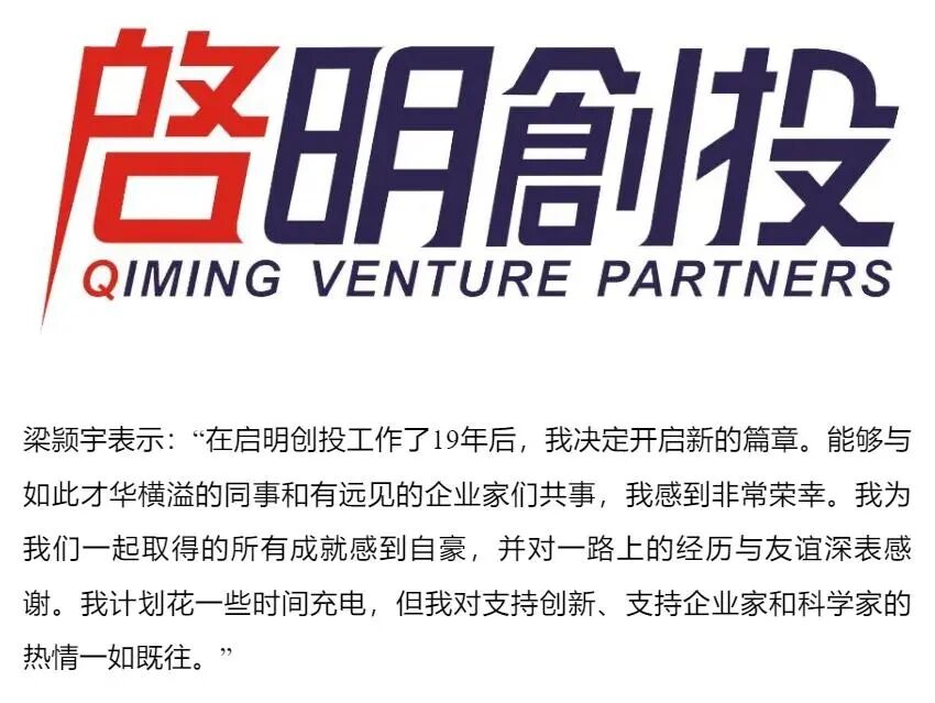2月17日,头部创业投资机构启明创投公众号发文显示,长期担任主管合伙人的梁颕宇已正式离职。梁颕宇曾在启明创投工作达19年,此前为该机构五位主管合伙人之一,主要领导启明创投在医疗健康领域的投资。