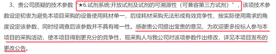质疑也基本被驳回,仅1项技术参数质疑接受,对招标文件作出修改。