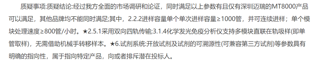经销商质疑事项:经过我方全面的市场调研和论证,同时满足以上参数有且仅有深圳迈瑞的MT8000产品可以满足,其他品牌均不能同时满足,应予以废标处理。
