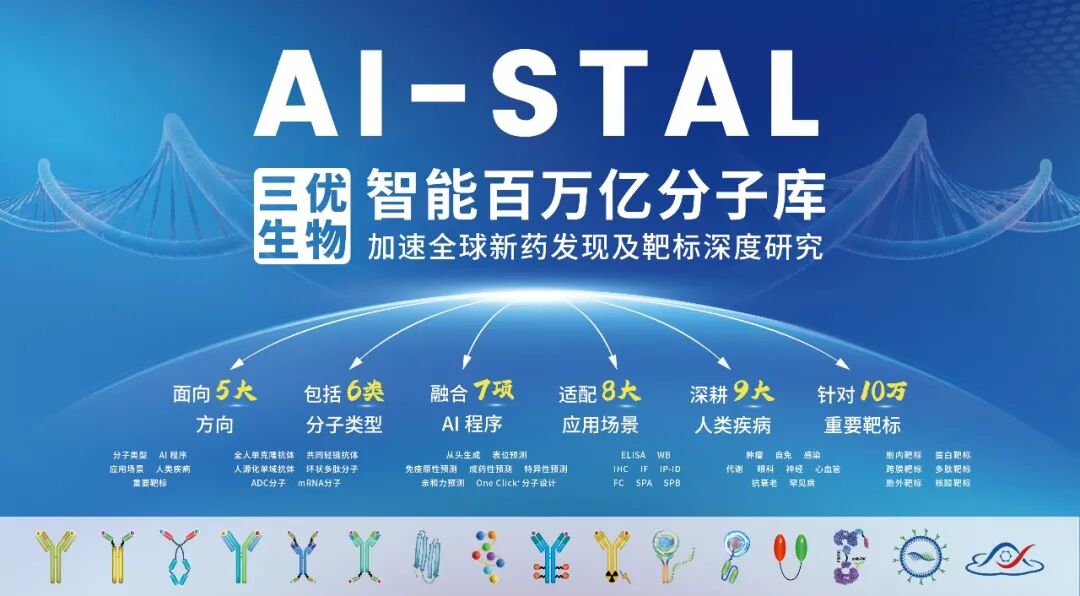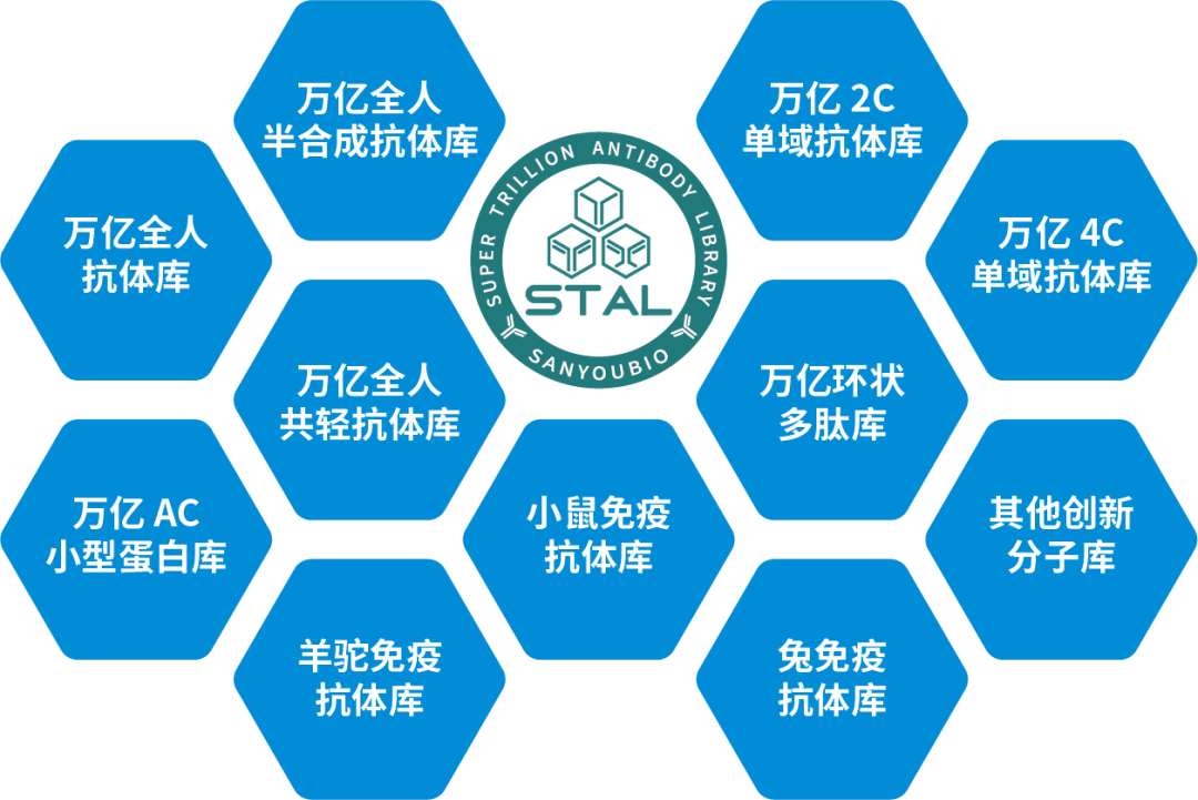三优生物智能超万亿分子发现平台由十大子平台组成,涵盖了多种分子类型。具体包括,万亿全人抗体发现平台、万亿共同轻链单抗发现平台、万亿2C型单域抗体发现平台、万亿4C型单域抗体发现平台、万亿环状多肽发现平台、万亿新型靶向蛋白发现平台、磁阵列小鼠免疫抗体发现平台、磁阵列羊驼免疫抗体发现平台、磁阵列兔免疫抗体发现平台和磁阵列犬免疫抗体发现平台。