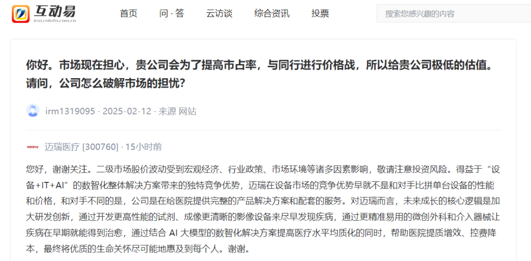来源:IVD资讯整理自迈瑞互动平台 2月24日,有投资者向迈瑞医疗提问,你好。市场现在担心,贵公司会为了提高市占率,与同行进行价格战,所以给贵公司极低的估值。请问,公司怎么破解市场的担忧? 公司回答表示,您好,谢谢关注。二级市场股价波动受到宏观经济、行业政策、市场环境等诸多因素影响,敬请注意投资风险。得益于“设备+IT+AI”的数智化整体解决方案带来的独特竞争优势,迈瑞在设备市场的竞争优势早就不是和对手比拼单台设备的性能和价格,和对手不同的是,公司是在给医院提供完整的产品解决方案和配套的服务。对迈瑞而言,未来成长的核心逻辑是加大研发创新,通过开发更高性能的试剂、成像更清晰的影像设备来尽早发现疾病,通过更精准易用的微创外科和介入器械让疾病在早期就能得到治愈,通过结合 AI 大模型的数智化解决方案提高医疗水平均质化的同时,帮助医院提质增效、控费降本,最终将优质的生命关怀尽可能地惠及到每个人。谢谢