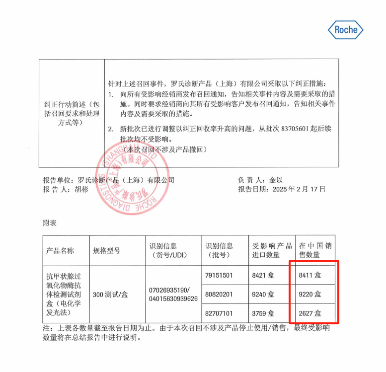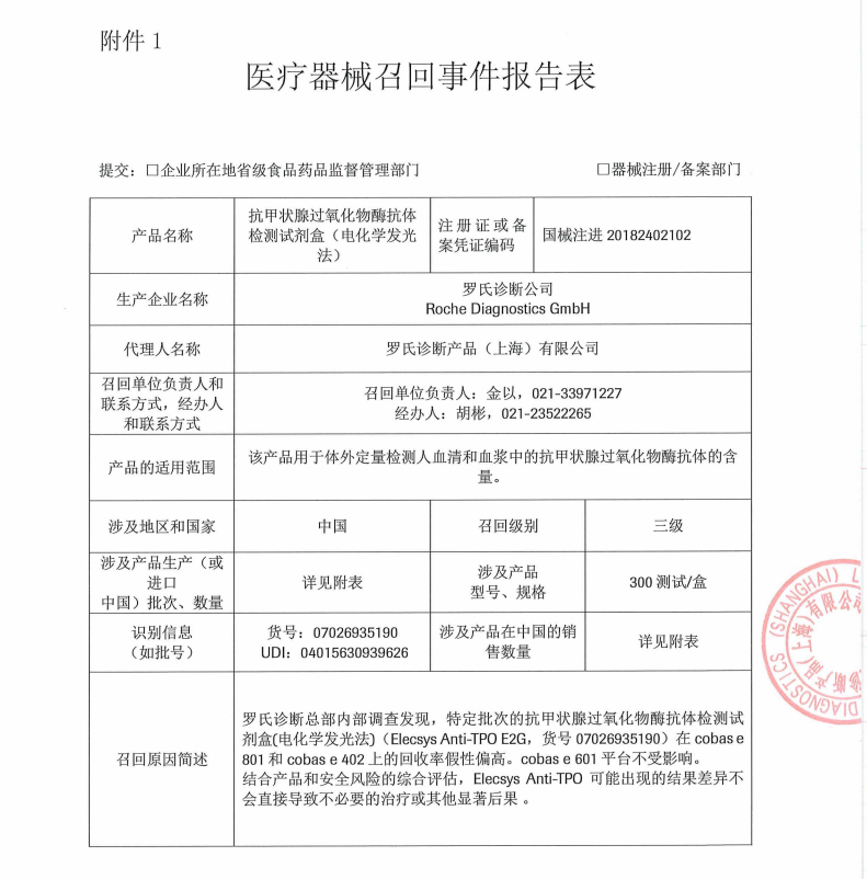 来源:上海市药监局 罗氏诊断产品(上海)有限公司报告,罗氏诊断内部调查发现,特定批次的抗甲状腺过氧化物酶抗体检测试剂盒(电化学发光法)(Elecsys Anti-TPO E2G,货号07026935190)在cobas e 801和cobas e 402上的回收率假性偏高。cobas e 601平台不受影响。结合产品和安全风险的综合评估,Elecsys Anti-TPO可能出现的结果差异不会直接导致不必要的治疗或其他显著后果。罗氏诊断公司对其生产的抗甲状腺过氧化物酶抗体检测试剂盒(电化学发光法)(注册证号:国械注进20182402102)主动召回。召回级别为三级。涉及产品的型号、规格及批次等详细信息见《医疗器械召回事件报告表》。 据统计,本次召回共涉及三个批次,共计20258盒。300测试/盒,累计607万测试!