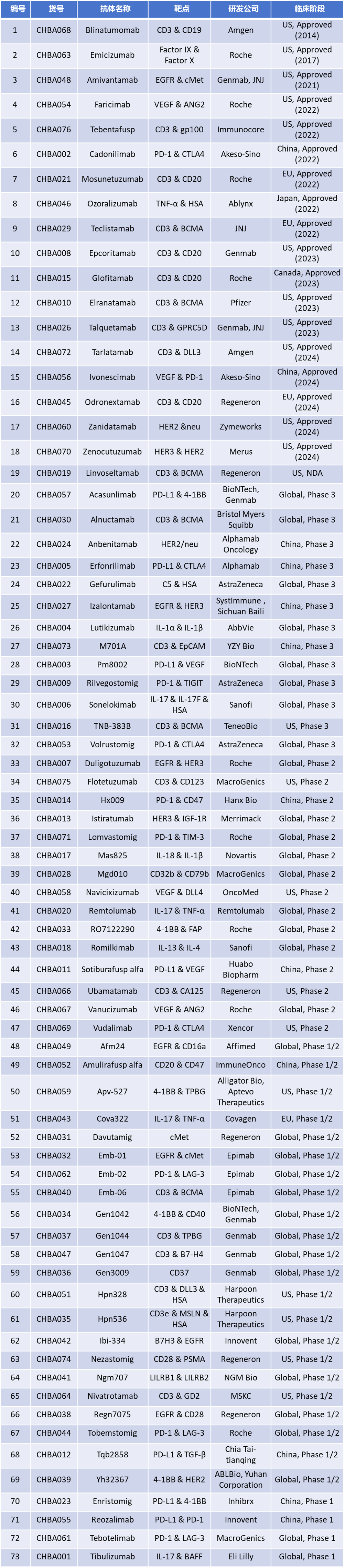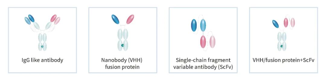 本次推出的双抗参比品涵盖CrossMab,Duobody,BiTE,DRAT,Fab等数十种构型,分子类型多且具有广泛的代表性,全部73种双抗参比品构型概览如下图所示: