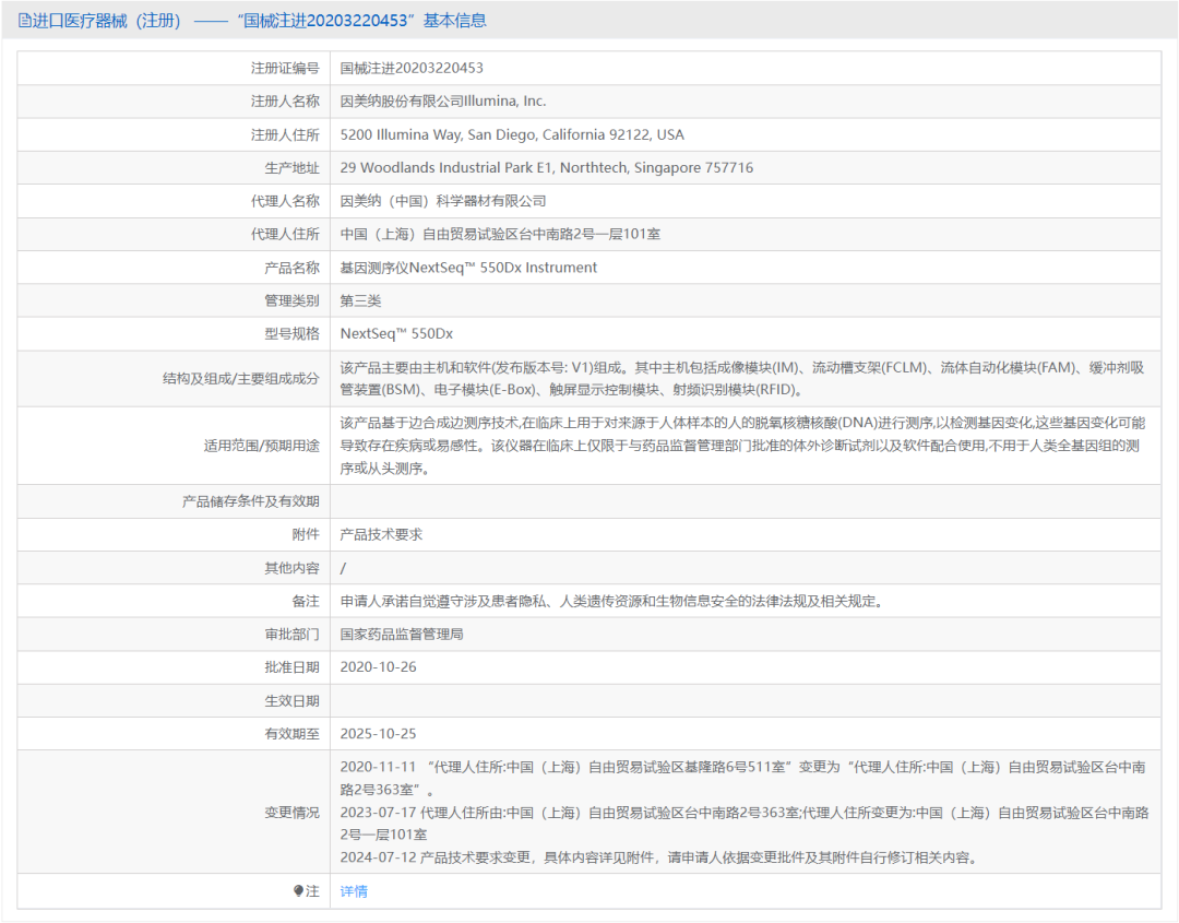 此次公告中国械注进20203220453的Illumina NextSeq™ 550Dx,早在2020年就已获批,更新目的在于到期续证。