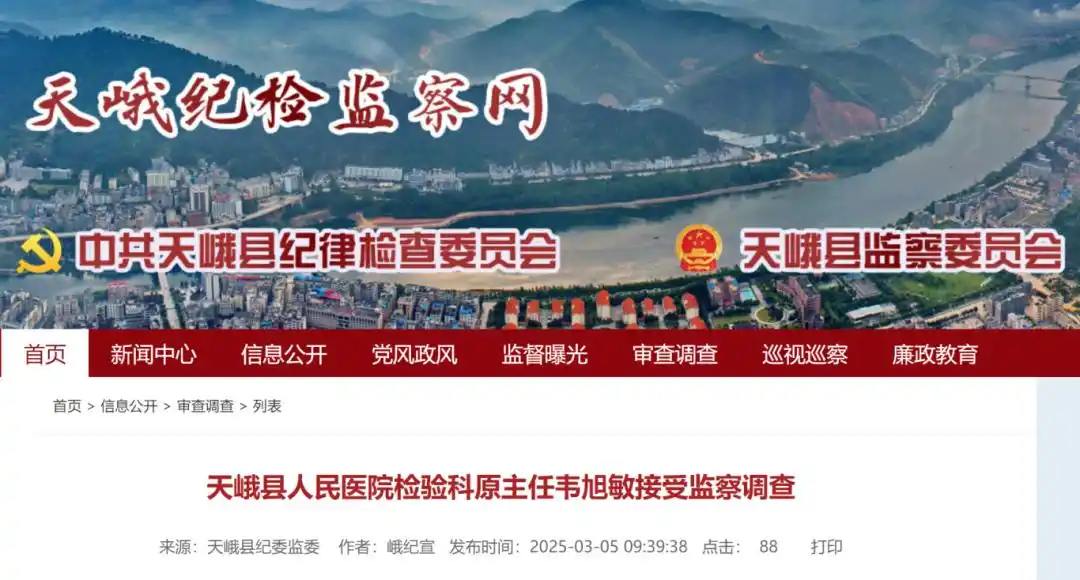 3月5日,据天峨县纪委监委官网发布的通报,天峨县人民医院检验科原主任韦旭敏涉嫌严重违法,目前正接受天峨县监察委员会监察调查。