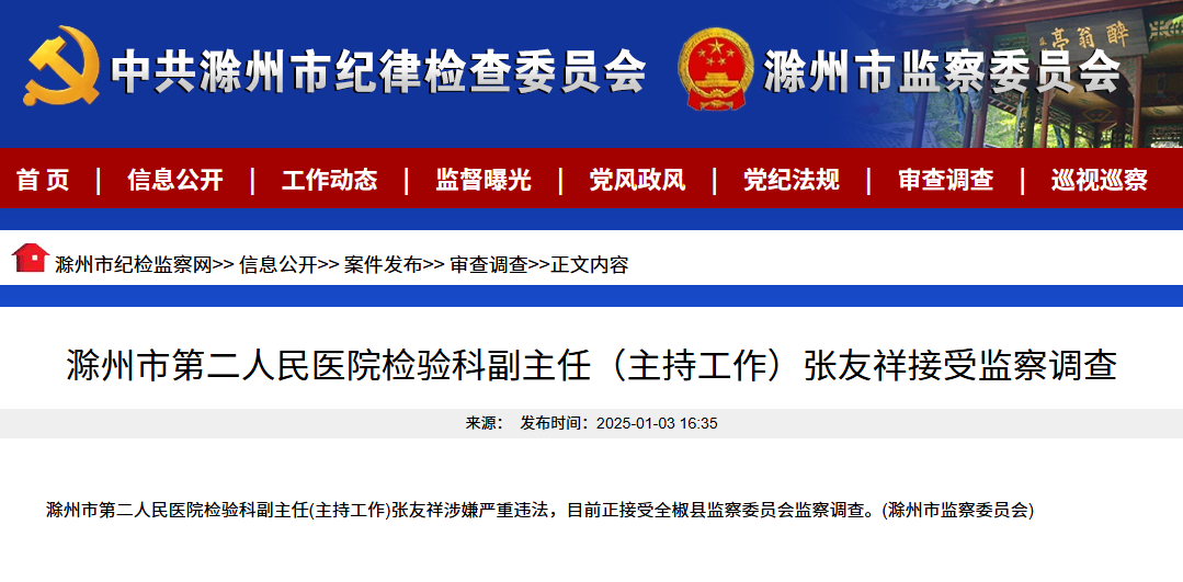 1月3日,据滁州市纪检监察网发文通报,滁州市第二人民医院检验科副主任张友祥涉嫌严重违法,目前正接受全椒县监察委员会监察调查。