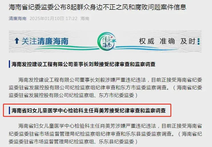 1月10日,据海南省纪委监委官网清廉海南网通报,海南省妇女儿童医学中心检验科主任肖美芳涉嫌严重违纪违法,目前正接受海南省纪委监委驻省市场监督管理局纪检监察组纪律审查和乐东县监委监察调查。
