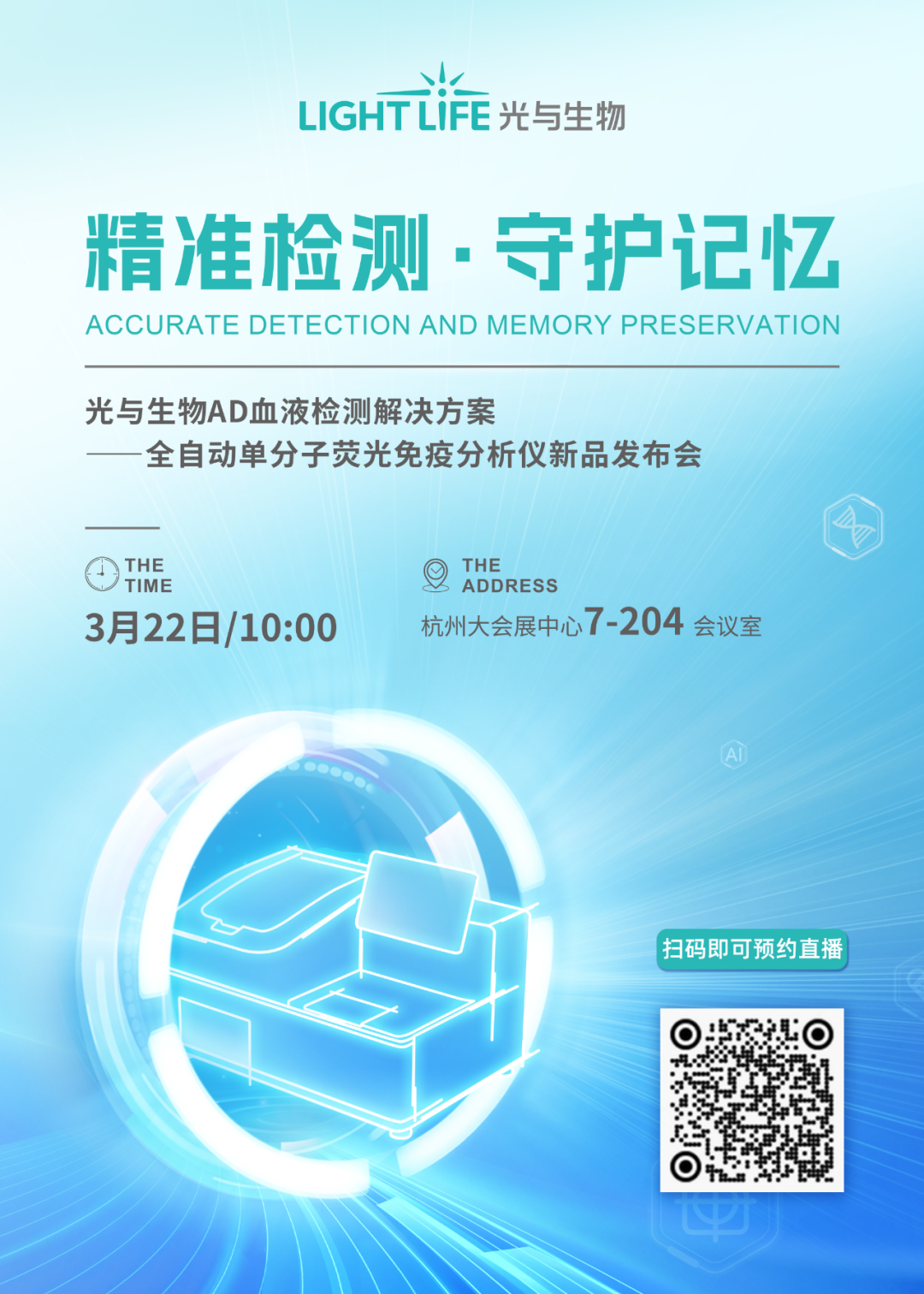 光与生物将携最新全自动单分子荧光免疫分析仪亮相7-A0401展位,并于3月22日10:00-12:00在7-204会议室举办“精准检测 守护记忆”新品发布会,为AD防治注入创新动能。