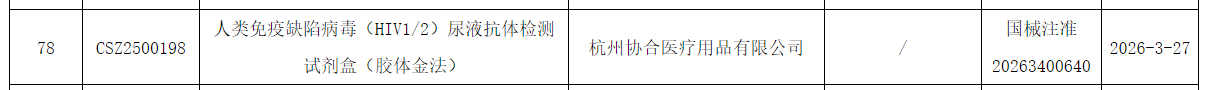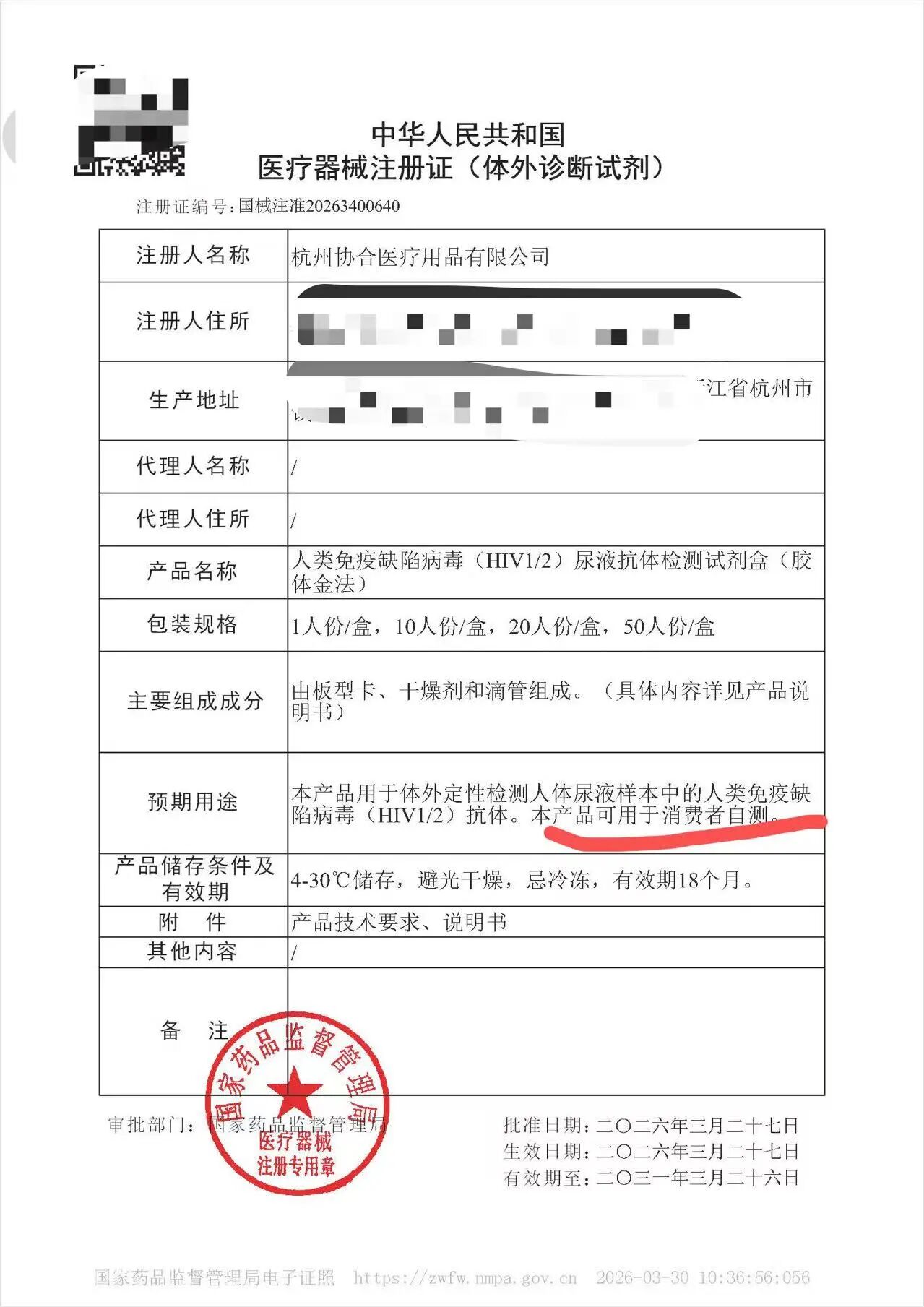近日,国家药品监督管理局正式批准了一款新型人类免疫缺陷病毒(HIV-1/2)尿液抗体检测试剂盒的注册申请(国械注准20263400640),获证企业为杭州协合医疗。