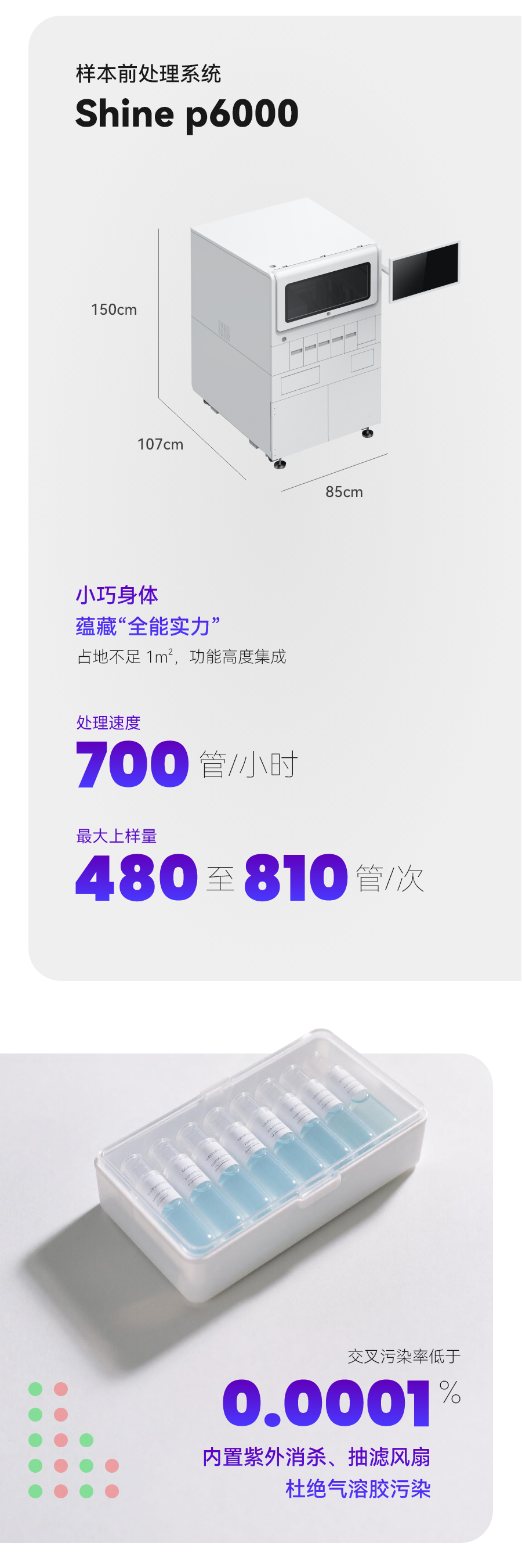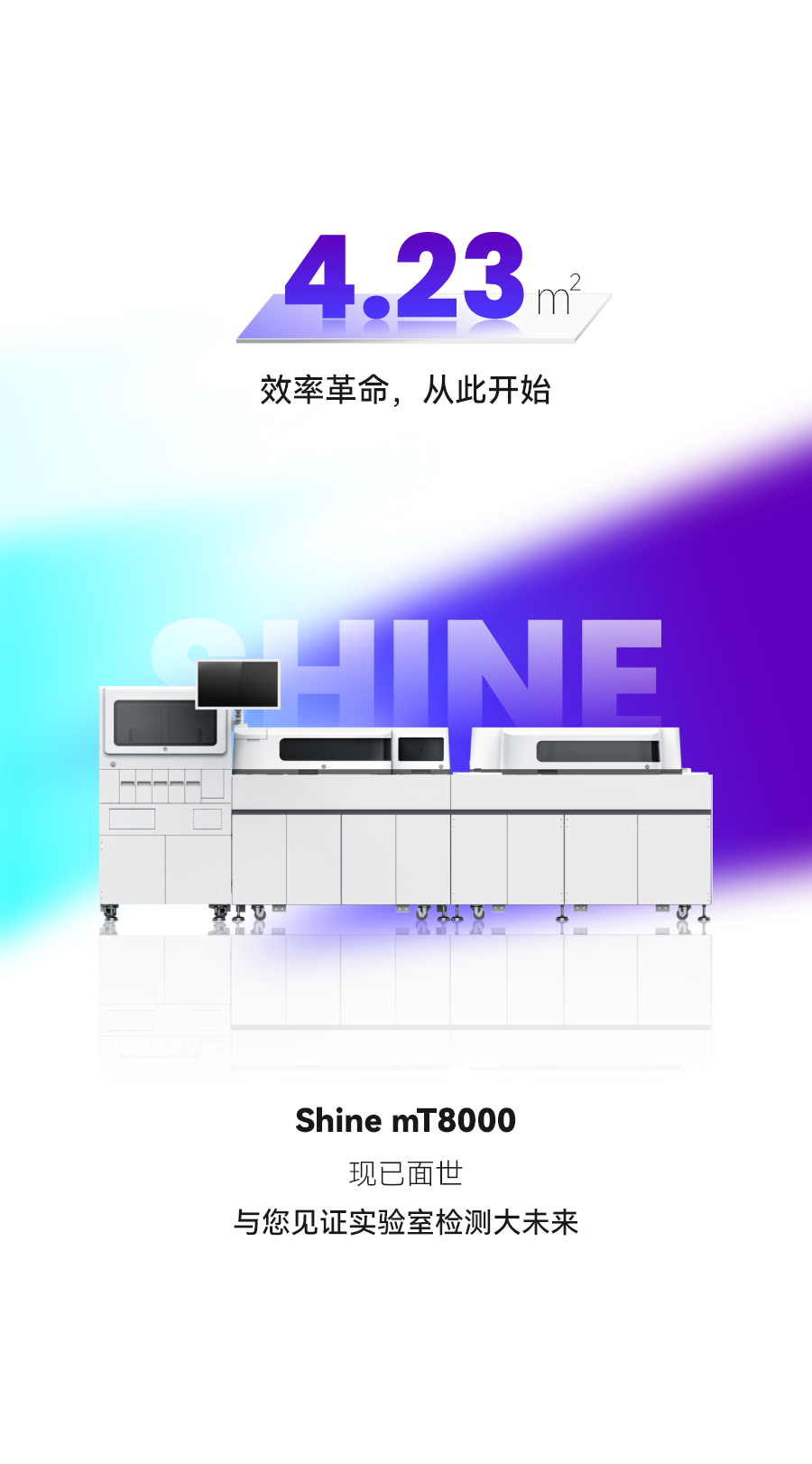 其搭载的 Shine p6000 样本前处理系统占地不足 1㎡,样本处理速度超过 700 管/小时;免疫模块单机速度达 900 测试/小时,生化模块综合检测速度达 2800 测试/小时,首个结果时间 ≤10 分钟。系统深度融合 AI 视觉识别技术,实现血清质量智能检测与样本全流程精准监控,以高效检测、极致空间、安全智能、开放兼容四大核心优势,精准破解实验室空间局促、效率瓶颈与人工依赖等行业痛点。