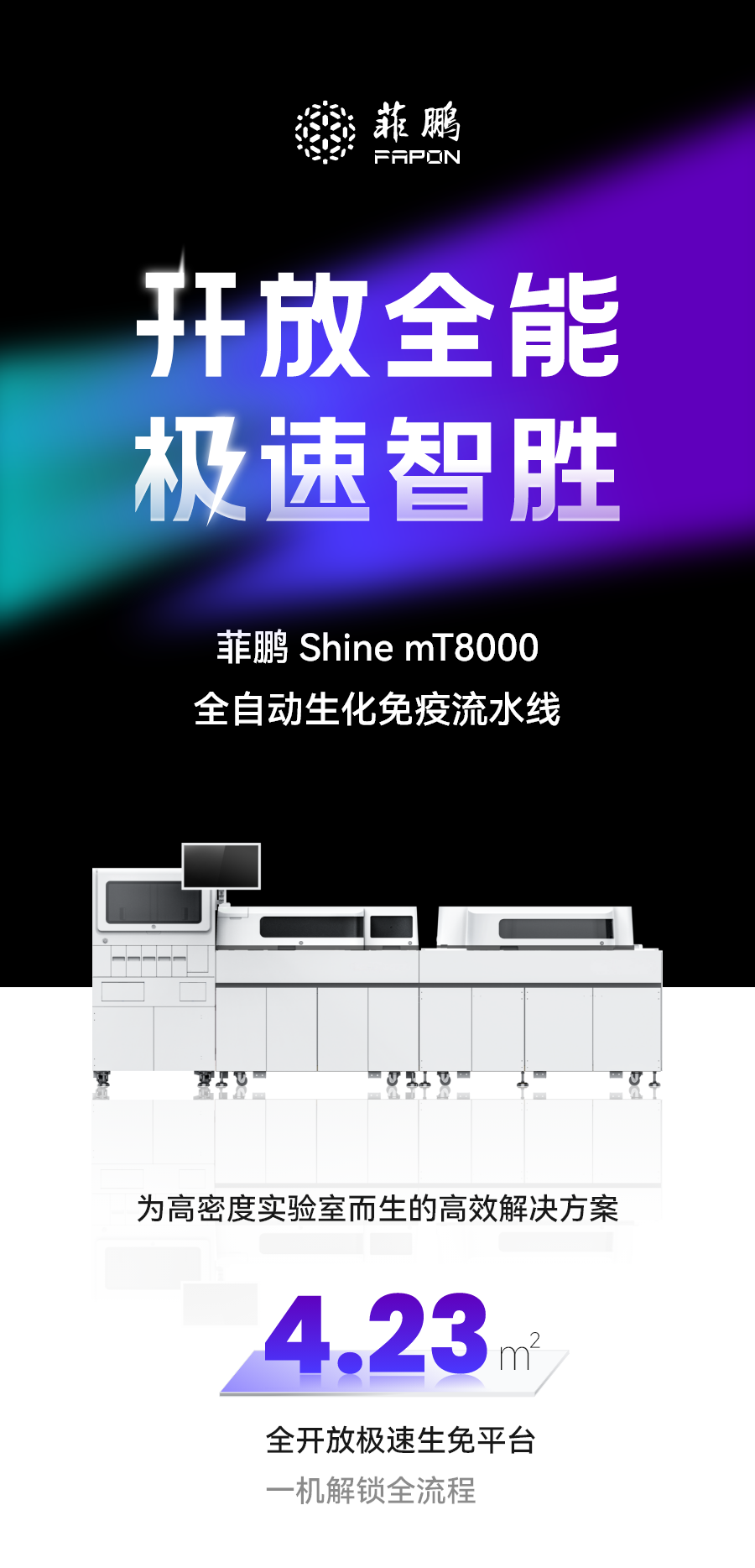 3月21-23日,CACLP在厦门国际博览中心举办。展会期间,菲鹏成功举办分享交流会活动。会上,菲鹏重磅推出 Shine mT8000全自动生化免疫流水线。这款为高密度实验室而生的高效生免检测解决方案,以 4.23㎡ 全开放极速生免平台实现“一管血”全流程检测。