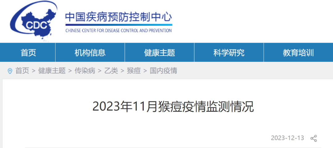 12月13日,中疾控官网通报,2023年11月1日-30日,中国内地(不含港澳台)新增报告80例猴痘确诊病例,其中广东12例、北京10例、上海8例、江苏7例、浙江5例、湖南5例、四川4例、福建4例、安徽4例、辽宁3例、吉林3例、海南3例、广西3例、湖北2例、重庆1例、山东1例、内蒙古1例、江西1例、河南1例、贵州1例、甘肃1例,无重症、死亡病例报告。