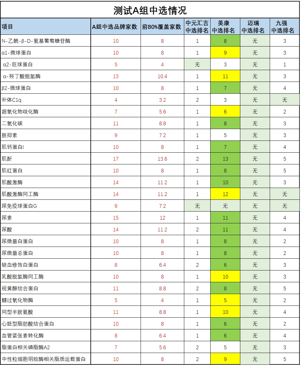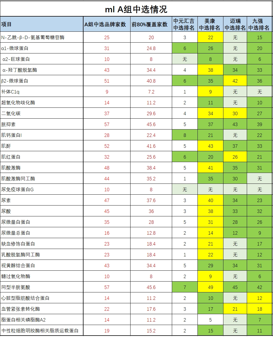 今天就抽取当今中国最优秀的四家生化企业——迈瑞、中元汇吉、美康、九强,来看看它们在此次集采中的精彩表现。从医保局公布的浩瀚数据中一个个抠出来它们各自的中选名次,并给予归纳,我们只看A组,因为B组可忽略不计,先看ml A组(见下图2)。