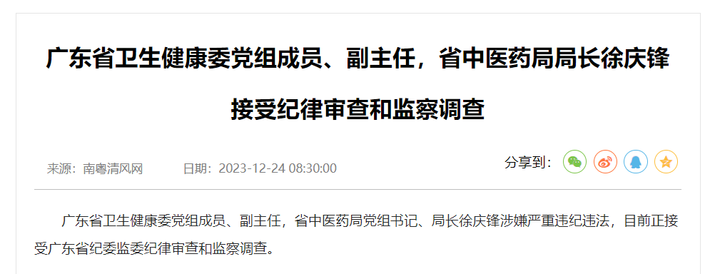 广东省卫生健康委党组成员、副主任,省中医药局党组书记、局长徐庆锋涉嫌严重违纪违法,目前正接受广东省纪委监委纪律审查和监察调查。