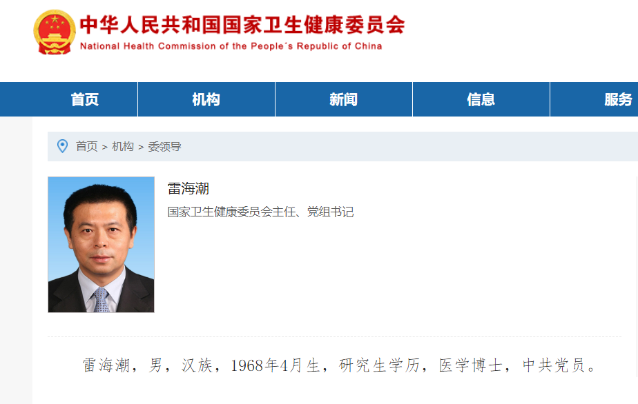 此前,5月6日,国家卫健委网站“委领导”一栏信息显示,雷海潮已任国家卫生健康委员会党组书记。