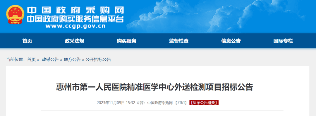 近日,中国政府采购网发布《惠州市第一人民医院精准医学中心外送检测项目招标公告》,预算金额高达2185万元。