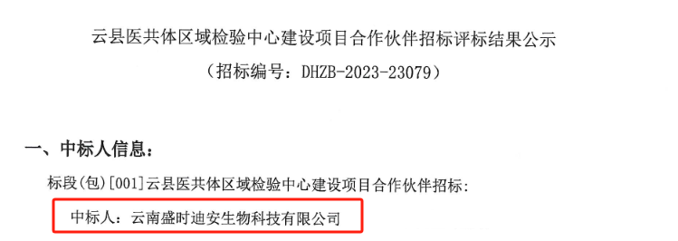 云县人民医院为全县医共体区域检验中心检验、输血、病理所有试剂、耗材配送,公开招标1家供应商,服务期长达5年。中标结果显示,由云南盛时迪安生物科技有限公司独家中标。
