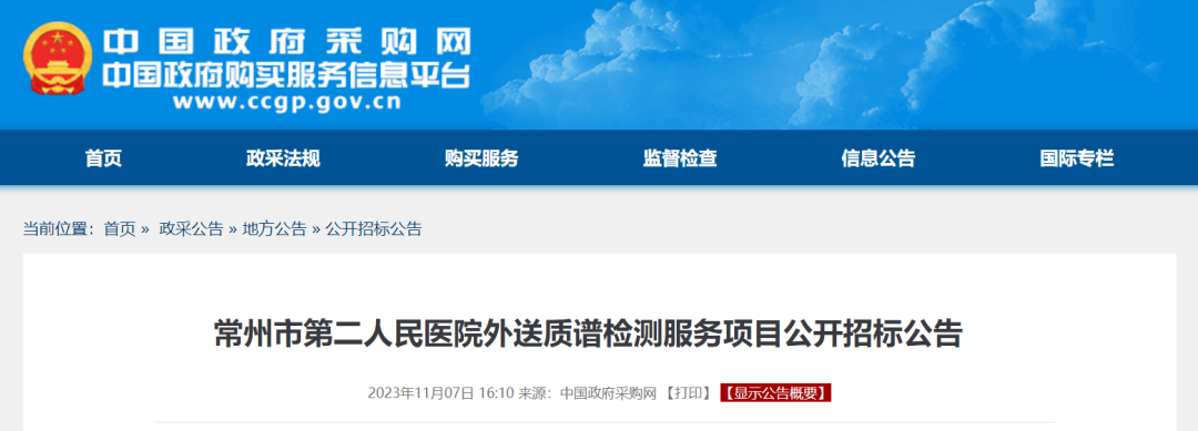 4.采购需求:本项目为常州市第二人民医院外送质谱检测服务项目,具体内容详见公开招标文件。