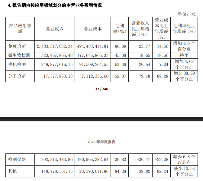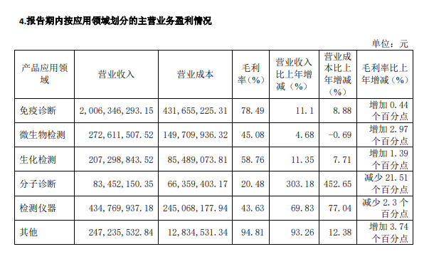 综合来看,占大头的免疫诊断前两年两位数增长,2024年几乎无增长;生化诊断由于集采,2024年缩水了一些,保持有2个多亿的营收;分子诊断波动较大,不过营收没有过亿,总体影响不大;微生物板块一直保持着较好的增长,有3.6亿的盘子;检测仪器方面,也是一个近4亿的盘子。