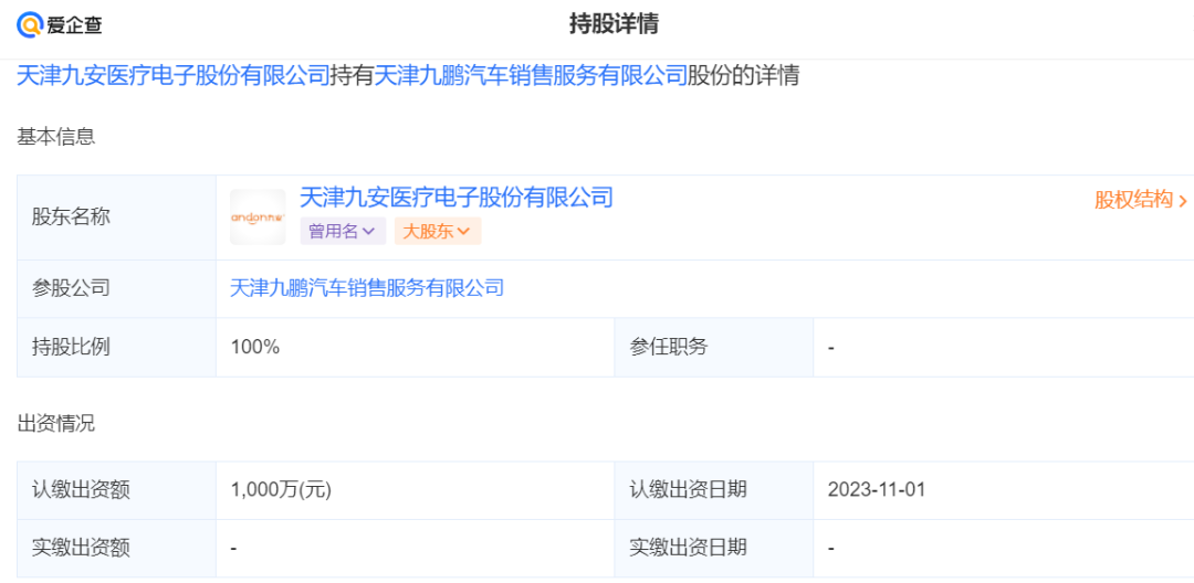 而这已不是九安医疗第一次跨界“卖车”,公司曾于2021年投资成立枣庄九鹏汽车销售服务有限公司,为小鹏汽车提供销售服务,首家门店于2022年1月完成开业验收。